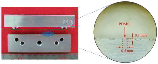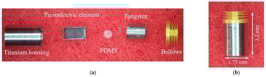 Each component of the RW piezoelectric transducer was manufactured based on parameters derived from the FEA results. Among the components, the piezoelectric elements (PAZ-10-0079; Murata Manufacturing Co. Ltd., Kyoto, Japan) and bellows (custom-made by Servometer Inc., Cedar Grove, NJ, USA) were also used in previous studies. The piezoelectric element had a width of 0.9 mm, depth of 0.9 mm, and height of 1.6 mm, and the bellows had a diameter of 1.75 mm, height of 0.8 mm (including the trim height of 0.3 mm), and three corrugations. The titanium housing (Ti-6AL-4V ELI; 1.75 mm in diameter and 2.5 mm in height) and tungsten (1.21 mm in diameter, 1.4 mm in height, and 26.9 mg in mass; 99.95% pure tungsten) were machined by computer numerically controlled (CNC) lathe milling. PDMS was manufactured using Sylgard®184 (two-part polymer: base elastomer and curing agent; Dow Corning, Midland, MI, USA). After mixing the two parts according to the standard mixing ratio (10 parts base elastomer and 1 part curing agent) of PDMS [], air bubbles were completely removed in a vacuum chamber. The elastomer without bubbles was added to a mold (Figure 6), and solidified at 100 °C for 40 min in a temperature-controlled chamber. The hardened elastomer was then removed from the mold to obtain PDMS with a diameter of 0.5 mm and height of 0.1 mm (Figure 6). Figure 7a shows an exploded view of the RW piezoelectric transducer parts. The transducer was assembled at a probe station equipped with a microscope, and the assembled transducer is shown in Figure 7b.