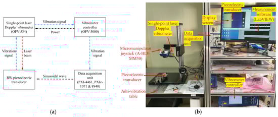(a) Block diagram of the measurement system; (b) experimental environment for measuring piezoelectric transducer output characteristics.