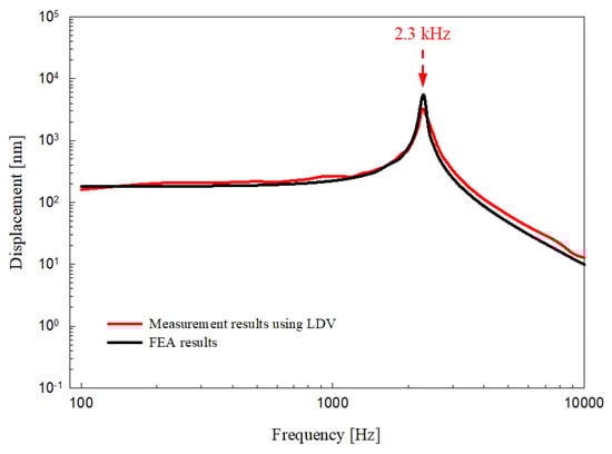 The output characteristics of the piezoelectric transducer were measured using a non-contact vibration measurements system consisting of a data acquisition unit (NI PXIe-8840 controller, NI PXIe-1071 chassis and NI PXI-4461 sound-vibration module; National Instruments Corp., Austin, TX, USA) and a single-point laser Doppler vibrometer (LDV; OFV-551 sensor head and OFV-5000 controller; Polytec GmbH, Waldbronn, Germany) []. The measurement system generated a sinusoidal signal to drive the piezoelectric transducer, and simultaneously collected the vibration signals of the piezoelectric transducer measured by the LDV (Figure 8a). Figure 8b shows an experimental environment for measuring the output characteristics of the proposed piezoelectric transducer. The transducer in the no-load condition was firmly fixed to the anti-vibration table using cyanoacrylate glue, and the angle of incidence of the laser beam was adjusted to be perpendicular to the center of the bellows using a micromanipulator joystick (A-HLV-MM30; Polytec GmbH). After applying a constant voltage of 6 VP to the transducer through the sound-vibration module (NI PXI-4461), the output characteristics of the transducer were measured with LDV. The output characteristics of the proposed RW piezoelectric transducer (red line) measured by LDV are shown in Figure 9. A comparison of the measurement and simulation results (black line) indicated that the frequency-response characteristics were near-identical. The resonance frequencies were generated at the same location. However, slight differences in frequency magnitude were apparent, reflecting a mass error during tungsten processing and some misalignment during assembly. The tungsten mass difference (theoretical compared to actual) was 0.3 mg. However, as shown in Figure 9, this very small difference did not affect the location of transducer resonance. If the transducer were to be manufactured in a more advanced facility, differences in output characteristics caused by misalignment would be reduced.