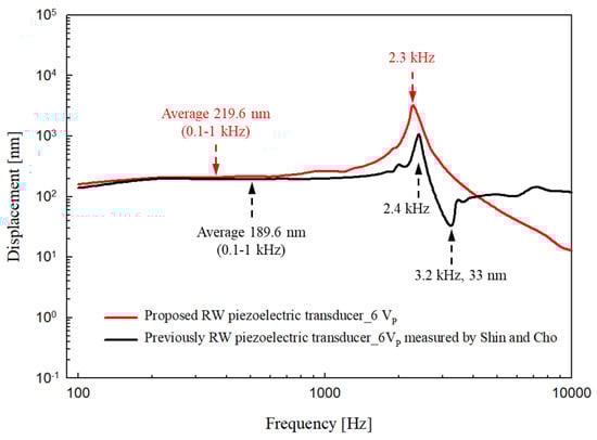 Comparison of the response tendencies of the proposed piezoelectric transducer (red line) and the previous one (from Shin and Cho; black line) driven by 6 VP.