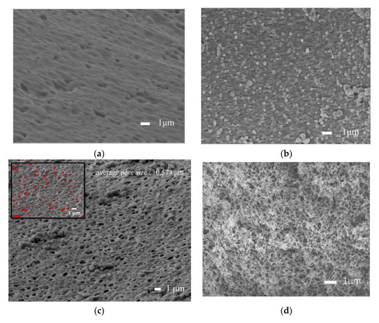 SEM images of sensitive CA membrane. Surface section (a) and cross-section (b) of the membrane without PEG 400; surface section (c) and cross-section (d) of the membrane with PEG 400.