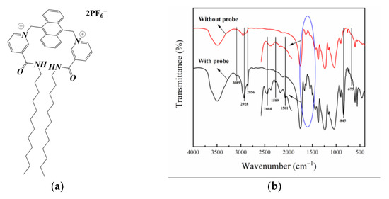 The chemical structure of the fluorescent probe AMDP is shown in Figure 3a [28] and the FT-IR spectra of the CA membrane with and without the addition of AMDP are shown in Figure 3b. The CA membrane with AMDP has a series of characteristic peaks by comparison, such as 3089, 2928, 2856, 1664, 1589, 1501 cm−1. The absorption peak at 3089 cm−1 is the C–H stretching vibration peak of the aromatic hydrocarbon ring; the peaks at 1589 and 1501 cm−1 are both stretching vibration peaks of the aromatic hydrocarbon ring skeleton; the peaks at 2928 and 2856 cm−1 are respectively the C–H antisymmetrical and symmetrical stretching [40] vibration peaks of the alkane; the peak at 1664 cm−1 is the C=O stretching vibration peak of the amide [41]. Within the fingerprint region, the absorption peaks 845 and 675 cm−1 are the out-of-plane deformation vibration absorption peaks of C–H. Therefore, the AMDP was successfully fixed into the CA membrane by the immersion precipitation method and the composition structure of the probe was not changed.