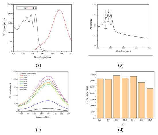The fluorescence spectrum of the fluorescence intensity at 535 nm at different excitation wavelengths and the emission fluorescence spectrum at an excitation wavelength of 390 nm (a). Absorption spectrum of the AMDP–SO42− fluorescent complex (b). The fluorescence spectrum of the fluorescent complex at excited wavelengths from 370 to 440 nm (c) and the intensity of the fluorescent complex’s fluorescence under different pH conditions (d).