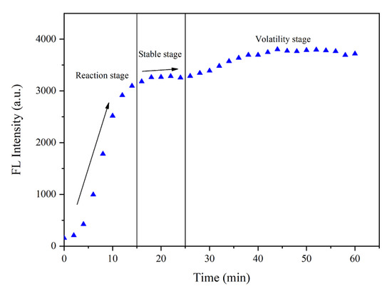 There are three stages in the formation of the fluorescent complex by the reaction of the probe AMDP with a sulfate ion. The first 15 min are the first stage of the reaction. The first step is the rapid reaction of the probe AMDP with sulfate radicals to form fluorescent complexes; the fluorescence intensity of solution increases rapidly as a consequence. With the eventual decrease in reaction rate, the fluorescence intensity of the solution stabilizes at a plateau stage. The fluorescence intensity of the complex is stable from 15 to 25 min. When the reaction is completed, the fluorescence intensity of the fluorescent complex in the solution fluctuates for a period of time, and finally weakens to a very low fluorescence level. The fluorescence intensity of the complex at 25 min was used as the reference standard for measurement. The fluorescence intensity time curve of the fluorescent complex formed by the probe AMDP and sulfate ion is shown in Figure 5, and the dividing points of three stages are 15 min and 25 min, respectively.