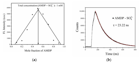 The complexation ratio of the fluorescent complex formed by the combination of sulfate ions and AMDP was researched by the Job plot method [43,44], as shown in Figure 6a. This result was confirmed by the Job plot method in which the fluorescence intensity exhibits a maximum at a molar fraction of approximately 0.5, indicating that a 1:1 stoichiometry was the most likely binding mode for AMDP and SO42− ion. The 1:1 binding ratio of the fluorescent complex was also consistent with the binding pattern mentioned in the references [26]. Fluorescence lifetime is the essential parameter of matter producing a fluorescent signal. It refers to the time required for the fluorescence intensity of matter to decay to 1/e after being excited, which reflects the average stagnation time of an electron in an excited state. The fluorescence decay curve of the AMDP–SO42− fluorescent complex was measured by time-correlated single photon counting (TCSPC), as shown in Figure 6b. The decay of the fluorescence lifetime of the complex was in accordance with the double exponential fitting calculation. The fluorescence lifetimes were 23.22 ns and 165.97 ns, and proportions of preexponential factors of both components were 27% and 73%, respectively. The period of the excitation LED source (40 kHz), 25 μs, was much longer than the fluorescence lifetime of the fluorescent complex, which means that the phase difference caused by the change of fluorescence lifetime will not be particularly obvious.