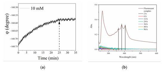 As an essential parameter of the sulfate ion optical fiber sensor, the reliability of the sensitive CA membrane was demonstrated. As shown in Figure 7a, the 10 mM sulfate ion solution was tested by the sensor and the phase was stable after 25 min, which showed that the fluorescent complex was successfully synthesized in the sensitive membrane and the stability was excellent. A leakage experiment was also carried out to ensure that AMDP would not leak during the monitoring process and contaminate the test solution. The absorption spectra of the 10 mM sulfate solution into which the sensitive membrane was immersed from 2 h to 96 h were studied, as shown in Figure 7b. The characteristic absorption peaks of the fluorescent complex were not observed in the absorption spectra, which indicated that the immobilization of AMDP in the membrane was successful and that the fluorescent complex was stable during the measurement process.