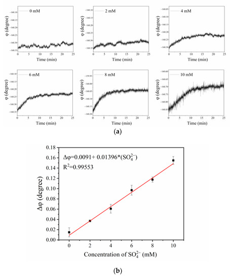 The average of the phase values was collected at the 1st minute and the 25th minute. The delay phase was obtained by the two average values, which could eliminate mechanical errors and obtain more accurate values. Each concentration of sulfate ions was measured by the sensor many times, and the corresponding standard deviation of phase difference value was obtained. The sensor has high detection stability, and the maximum variance and average variance were 0.00955 and 0.006657, respectively. The calibration experiment of the sensor revealed the relationship between the sulfate concentration and the phase delay, as shown in Figure 8b. The relationship between the phase delay (Δφ) and the sulfate concentration followed Equation (4), and a linear relationship equation (R2= 0.99553) was obtained for a sulfate concentration range from 2 to 10 mM.