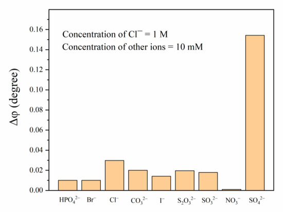 According to a previous study [28], it is known that the structure of the fluorescent probe AMDP has a cavity suitable for forming hydrogen bonds with a sulfate ion, which means that it can specifically bind with a sulfate ion. We carried out selective detection of common anions (HPO42−, Br−, Cl−, CO32−, I−, S2O32−, SO32−, NO3−, SO42−) in a concrete environment. The concentration of chloride ions was 1 M and other ions were 10 mM. The phase delay of the sensitive membrane (Δφ) did not change significantly except for SO42− in the presence of each of the above chemical substances, which indicates that the optical fiber sensor has favorable selectivity for SO42− ions, as shown in Figure 9.