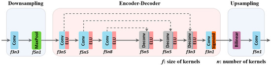TGL-Net is divided into three phases: downsampling, encoder–decoder, and upsampling. This structure is illustrated in Figure 2. The parameter settings related to the network structure are listed in Table 2, including the sizes and channels of inputs for every layer (presented as h × w × c), as well as the sizes and numbers of kernels (presented as f × f × n). A stride of one is used for all convolutional and deconvolutional operations.