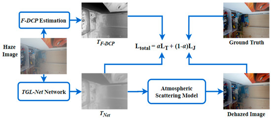 where the atmospheric light A can be set to A = (1, 1, 1), assuming that the initial input image is globally white balanced [32]. In (4), JNet is compared to the reference haze-free ground-truth image JGT to obtain dehazing loss LJ.