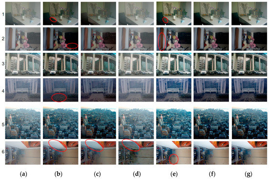 Figure 5 presents some examples for qualitative comparisons. Some noteworthy local areas are highlighted with red circles. In general, Cycle produces outputs with insufficient dehazing and many negative artifacts, particularly in images with a small depth of field, such as indoor image No. 6 in the last row in Figure 5d. DehazeNet tends to darken input images, which is very apparent in images nos. 1, 2, and 4 in Figure 5b (see the red-circled regions in these images). AOD outperforms DehazeNet, but still slightly darkens some white areas, such as the wall in image no. 6 in Figure 5c. F-DCP recovers images with brighter colours, but there are vertical stripes in some of the outputs of F-DCP (see the red-circled regions in images nos. 1, 2, and 6 in Figure 5e). Because F-DCP assumes that the DOF is larger at the top of a natural scene image and smaller at the bottom, images that do not satisfy this constraint will result in such artifacts. In general, visual comparisons reveal that the two TGL-Nets have dehazing performance comparable to that of DehazeNet and AOD, but with better colour fidelity (see the preservation of the white wall in image no. 6). Furthermore, although the proposed TGL-Nets are trained with guidance from F-DCP transmission maps, they do not learn the vertical stripe artifacts present in the F-DCP outputs. It is difficult to distinguish Figure 5f,g visually. However, the training of TGL-Net-Syn converged more slowly and unsteadily than that of TGL-Net-Mix, which will be discussed in a later section.