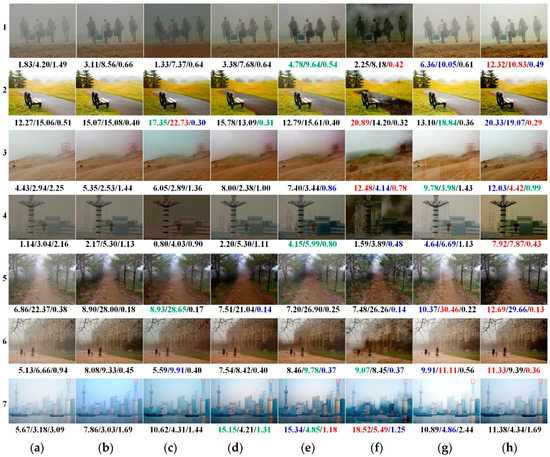 Figure 6 presents some examples for qualitative comparison. For reference, the AG, IE, and FADE values are listed in sequence below each image. Images nos. 1 and 4 in Figure 6c, as well as image no. 5 in Figure 6d, are darkened due to excessive dehazing of nearby objects by AOD and CAP. Similar to Figure 5, there are vertical stripes on the sandy ground in image no. 3 and on the distant trail in image no. 5 in Figure 6g based on unrealistic assumptions regarding the DOF by F-DCP. Additionally, obvious halos can be observed in regions where the DOF jumps in the output images generated by GDN, such as the sky in images no. 1, 3, 4, and 7, as well as the close pathway in image no. 2 in Figure 6f. Additionally, the colour of the sky in image no. 3 is changed from greyish to light pink or light blue in Figure 6b–f, indicating the introduction of colour distortions.