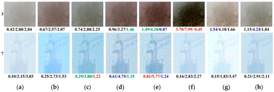 Local areas from red boxes in images nos. 3 and 7 in Figure 6 with local AG, IE, and FADE values listed below each image. The 1st, 2nd, and 3rd winners of each measurement are displayed in red, blue, and green colors, respectively. (a) Hazy Inputs. (b) DehazeNet [6]. (c) AOD [8]. (d) CAP [2]. (e) PDN [10]. (f) GDN [11]. (g) F-DCP [15]. (h) TGL-Net-Mix.