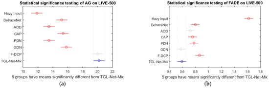 Statistical significance testing for AG and FADE measures on the dataset LIVE-500. Group of the proposed TGL-Nex-Mix is described in blue. Groups that have means significantly different from ours are described in red. The others are in grey. The centre of each circle corresponds to the mean value of 500 images of each group. (a) AG; (b) FADE.