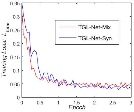 In addition, we compared the influences of using different training sets on training efficiency. Figure 9 presents the loss curves for TGL-Net-Syn (trained by only the synthetic image set A) and TGL-Net-Mix (trained by set A and the real-world image set B) as functions of the number of training epochs. The descending loss curves indicated that real-world training sets cause TGL-Net-Mix to converge more quickly and consistently. However, both networks reached convergence after only two or three epochs.