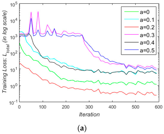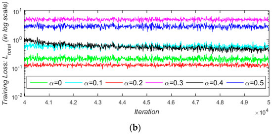 Loss curves for training TGL-Net-Mix by setting different values of loss trade-off parameter α, which is set from 0 to 0.5 with an increment of 0.1. For a better illustration, both vertical axes are shown in logarithmic scale. One iteration corresponds to training a batch of images with a batch size of 16. (a) Loss curve in iterations from 0 to 600; (b) loss curve in iterations from 4 × 104 to 5 × 104.
