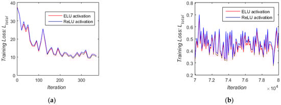 Loss curves for training the proposed network with ReLU and ELU activations, respectively. (a) Loss curve in iterations from 0 to 400; (b) loss curve in iterations from 7 × 104 to 8 × 104.