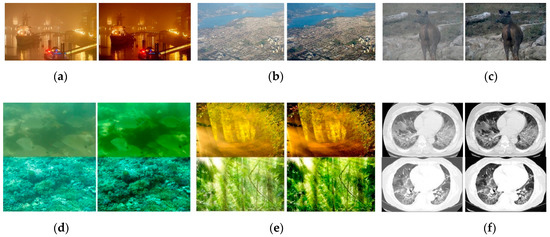 Extension to other potential applications. For each image pair, the left image is the input image and the right image is the enhanced image using the method described in this paper. (a) Night-time image; (b) remote sensing image; (c) low-contrast image; (d) underwater images; (e) images with halation; (f) CT scan images.