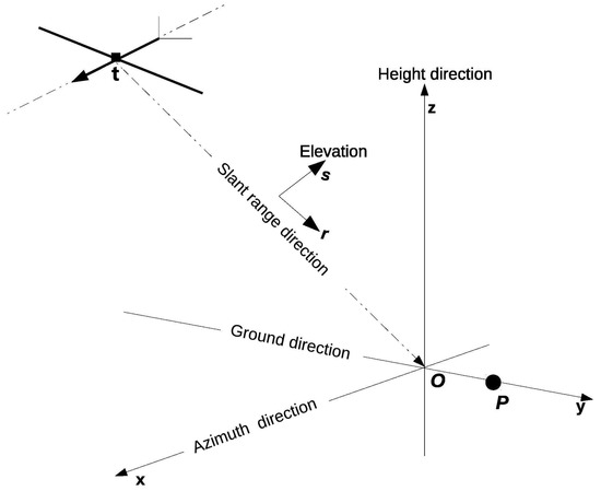 The spatial location of sensor changes along the flight path, which is defined as the azimuth direction in Figure 1. A target is specified at location: