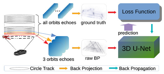 Illustration of our algorithm. In the training program, the upper route uses echoes from all orbits to generate ground truth images by back-projection (BP) algorithm. The lower route selects echoes of three orbits to produce raw BP images by back-projection algorithm. The network processes the raw BP images as input data and outputs predictions. The loss function, usually p-Norm, measures the distance between the predictions and ground truth images. In order to minimize the loss value, the parameters of network are optimized by the back propagation algorithm. In the training program, the parameters of network are fixed and the network predicts from raw BP images.