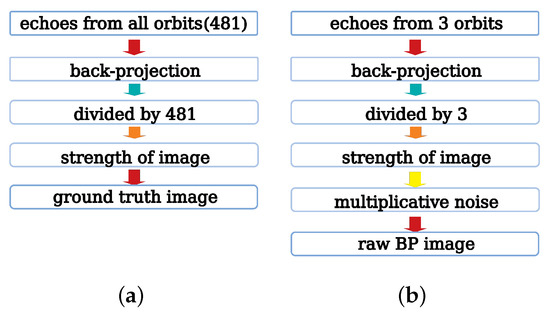 The processing flow of image generation. (a) is the generation of ground truth images. The back-projection algorithm processes echoes from all orbits to generate original complex back-projection images, which is then divided by the number of orbits (481) to normalize the images. Finally, the strength of the normalized complex images is extracted to be the final ground truth images. (b) is the generation of input raw BP images. Echoes from 3 orbits are selected to generate the original complex images, which is then divided by 3. Finally, the multiplicative noise is added into the strength images to produce the input raw BP images.