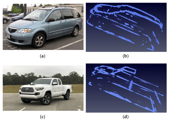 Testing set contains MPV and Pickup types, 2 cars in total. An MPV has a similar structure to the training set but not exactly the same and is regarded as the normal testing type. Pickup, regraded as a hard type, has more significant differences such as the isolated driver’s cab and open carriage, which do not appear in the training set. The images of cars in the testing set are shown in Figure 8.