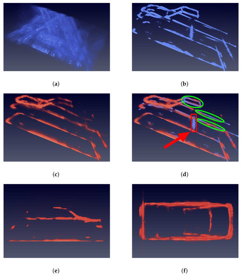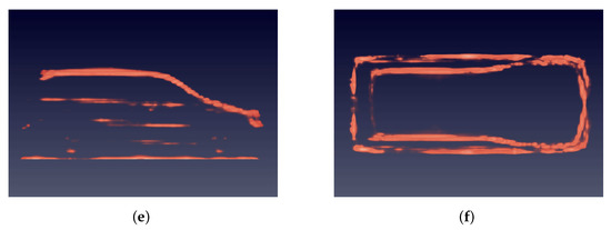 Images of Pickup car. Blue means the input and GT images. Orange indicates the prediction. (a) is the input image, which has powerful sidelobes and noise. (b) is the GT image. (c) is the prediction of network, from which can clearly recognize the drivers’ cube and open carriage. (d) is the overlap of GT and prediction images. (e) is the side view. (f) is the top view. It is obvious that the important features, the driver’s cube and open carriage marked with green circles are correctly predicted, which indicates that the network has good robustness. However, the red rectangle also figures out the shortage of the prediction.
