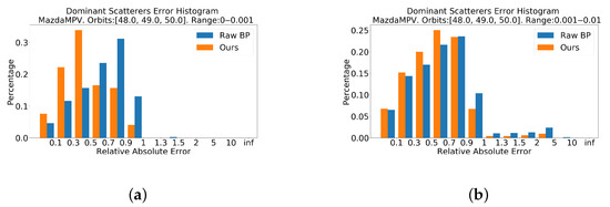 Besides intuitive vision results, some numerical analysis of the prediction are also made. Figure 11 shows histograms of dominant scatterers error distribution. In order to figure out the value inprovement in details, the dominant points are divided into four groups according to the rank of their strength. The error distribution of our method is closer to zero in all histograms. Specifically, in Figure 11a,c,d, the orange bars are much more higher than blue bars, which indicates the great improvement of strength. In Figure 11b, there is also slight improvement.