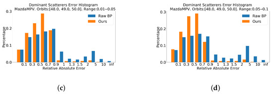Relative absolute error histograms of Pickup on dominant points. The closer the value is to zero, the better. (a) is the top 0.1% dominat points. (b) is the top 0.1% to 1%. (c) is the top 1% to 5%. (d) is the top 5% to 10%. Histograms in Figure 16c,d show that the proposed method improves the backscattering coefficient.