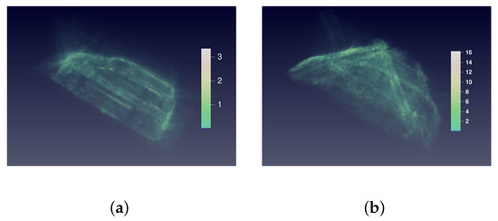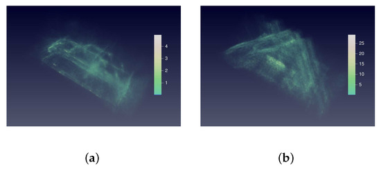 3D view of relative absolute error distribution of Pickup in space domain. (a) is the 3D view of RAE distribution of the prediction in Figure 15c. (b) is the 3D view of RAE distribution of the raw BP image in Figure 15a. The colorbars indicate the RAE value of two images. The RAE distribution of raw BP image is nearly full of the imaging space. In contrast, the RAE of the prediction locates at the surface of car, which proves that the sidelobes and noise are suppressed. From the numerical point of view, the RAE of prediction is less than 5, which is much smaller than that of raw BP image.