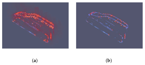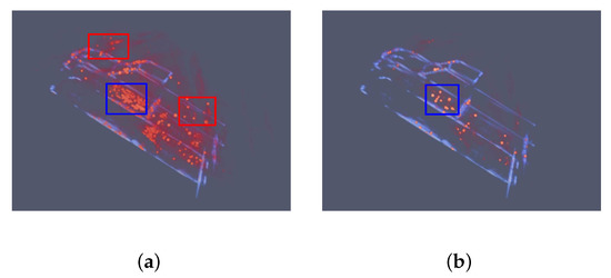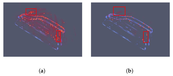 Results of the CS algorithm using echoes of 3 orbits degrees at pitching angle. Red represents the points produced by the CS algorithm. Blue means the GT images. (a) set the sparsity penalty as 1. (b) set the sparsity penalty as 10. Compared with results in Figure 13, the sidelobes and noise are still powerful. Even worse, there are lots of fake points above the front hook and at the back of the car, which are mard with red rectangles. In (b), the fake points still can not be ignored. The results become more sparse and not continuous.