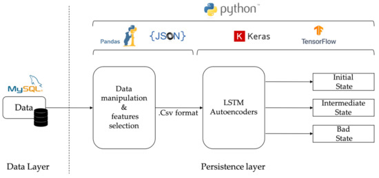 The LSTM-autoencoders are implemented using Keras, a Python library for developing and evaluating deep learning models. In particular, three individual LSTM-autoencoders are trained with data corresponding to each state: initial, intermediate, and bad. The segmentation of the training dataset is based upon historical maintenance records. Finally, and after the training phase, newly arrived JSON messages are passed through each autoencoder that form a parallel connected complex in order to be classified into one out of the three supported labels. On the basis of the achieved classification accuracy, the remaining useful life is determined, as mentioned in the previous section, and exported to the user of the system. During the experimentation stage, the accuracy of the results was cross-validated with the actual maintenance records of the case owner, as discussed in the following section.