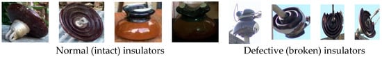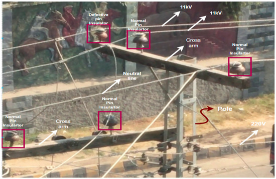 Low-voltage power distribution lines are the means of electricity distribution from the distribution grid to the end users. An important aspect of a primary distribution system is a continuous supply of electricity and the efficient performance of its equipment. Insulator strings are essential equipment in primary overhead power distribution lines because of their role in insulation and providing mechanical strength. An insulator’s efficiency is affected when exposed to pollution, environmental conditions such as dust, rain, wind, or snowfall, and wildlife. Components of such importance cause serious problems when damaged, both to the power supply and public safety. Every year, a number of human lives are taken due to electric shocks during the rainy season due to exposure to electric poles. In 2019, in the rainy season in Karachi, Pakistan, six people died due to electric shocks due to poor insulation of the distribution lines from the electric poles [1]. In order to prevent such severe and costly damage, periodic maintenance and detection of defects in the early stages are of great importance. Some of the defects present in primary distribution systems are broken insulators, broken cross arms, conductor corrosion, and vibration damage. Some normal and defective insulators from different view angles are shown in Figure 1. An illustration of the overhead primary power distribution lines is depicted in Figure 2.
