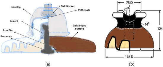 Internal structure of pin and suspension disc porcelain insulators: (a) internal structure of a suspension disc insulator, (b) the length parameters of the pin insulators.