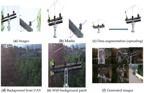 The dataset is divided into four classes, including pin insulator, disc insulator, faulty pin, and faulty disc insulator. To differentiate between the faulty (broken) insulators and normal (intact) insulators, insulators with a partly broken rain shed or a small piece broken off so that the white porcelain material is visible and insulators that are deformed are compared to a corresponding normal intact insulator. These faults could easily create a risk for pollution deposition and surface corrosion. Such different faulty (broken) insulators are shown in Figure 7b. The proportion of faulty insulators in the dataset is very small due to the unavailability of such insulators in the system. Such insulators are discarded by throwing them in the garbage as no proper method is available for their disposal. To overcome this problem and to increase such images in the training dataset, we followed the study in [28] to improve our dataset and remove the class imbalance. Frames are extracted from drone videos comprising different backgrounds and different light conditions. Faulty insulators from a different angles of view are then added to these backgrounds extracted from real images. Figure 8 shows the scenario for such dataset formation step by step.