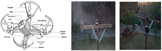 To improve the maintenance crew’s safety, power system components mounted on electric poles can be inspected with the use of drones. In this study, to perform our experiments, we developed a prototype of an electric pole, as shown in Figure 9, on which the faulty pin and disc porcelain insulators are mounted and examined using a DJI Tello drone [36], which is a programmable drone. The technical specification of the drone is presented in Table 1. The drone camera captures 5 megapixel stills with a field of view of 82.6° and records 720 p HD video footage at 30 fps in MP4 format. Frames of the video have been examined by the insulator detection model and the results are presented in the results section.