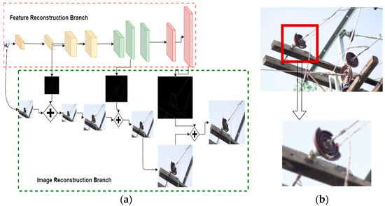 To improve the insulator fault detection performance the data acquired from UAVs and other sources, images should be of high quality and have rich features. During the acquisition of the training dataset, some images were blurred. Another problem was cropping the faulty insulator patch from images with multiple insulators with both normal and faulty pins and suspension discs, as shown in Figure 10. Cropping the image degrades the resolution of the images. Another problem was distortion in images due to UAV vibration and fuselage. To overcome these problems, we used LapSRN. Super-resolution techniques with deep Laplacian pyramids provide a fast and accurate super-resolution solution for high-resolution image reconstruction. Such a technique allows for reconstructing the low-resolution patches of faulty insulators taken from images consisting of both normal and faulty insulators. LapSRN is comprises two stages. A bundle of convolutional layers learns a non-linear feature map from the low-resolution input image in the feature extraction branch and upsamples the low-resolution image to a finer level in the image reconstruction branch, then with the help of convolutional layers, the residuals are predicted [29]. The overall workflow of the LapSRN algorithm on low-resolution images is shown in Figure 10.
