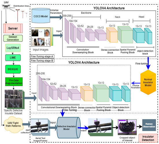 The proposed deep learning-based low-voltage porcelain detector consists of three stages. Data augmentation and image preprocessing, training and validation of both real and custom YoloV4 architecture, UAV path planning strategy, and real-time insulator detection. The framework for the low-voltage insulator detection is depicted in Figure 3. First, images of insulators, both normal and faulty pin and suspension disc types, are collected using a UAV, a digital camera, and a mobile phone for distribution line inspection. Different datasets are used in the fine-tuning and validation of the object detection model. The preprocessing of these datasets includes dataset generation, data augmentation, image reconstruction using LapSRN, low-light enhancement, image quality assessment, and dataset labeling. For the training stage, we utilized YoloV4 architecture by feeding in the training images. A normal insulator dataset is fed into the YoloV4 architecture in stage A and transfer learned with normal insulator features following stage B in which some of the previous layers are frozen and the detection layers are fine-tuned with the faulty insulators dataset. Such a strategy proved efficient in the detection of the faulty insulators in the aerial images and frames taken by the UAV for the distribution line inspection system.