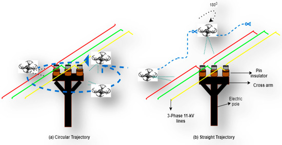 Flightpath strategies for the UAV for inspection of the insulators mounted on an electric pole. (a) Presenting a circular flight strategy (b) Presenting a straight flight path strategy.