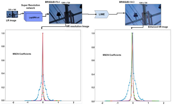 Faulty insulator inspection and maintenance are the top priority for electricity supply companies to maintain uninterrupted power supply to consumers. The need for efficient fault detection models is immense. For such requirements, we need to improve the quality of the training dataset and provide a highly efficient faulty insulator detection model which is accurate, fast, and provides reliable results. For this reason, as shown in Figure 15, a pipeline has been proposed in which a low-resolution image of 320 × 180 is fed into the super-resolution network based on deep Laplacian pyramids. The output of LapSRN is upsampled by a scale factor of 4. Such super-resolution networks preserve the quality better as compared to the traditional upscaling techniques. The image quality score is assessed by using blind no-reference image spatial quality estimation to prove the improvement in the quality of the image. For some of the training images, such as those with low visibility, the LIME technique is applied. Such an algorithm is efficient in making the object’s features in the image clearer and helps in learning better features in the detection model. After the implementation of LIME, again, the image quality score is calculated to prove the feature improvement of low-light images. As shown in Figure 15, an improvement of 12.1 points is achieved in the quality of the image. Different variants of the single low-light image can be obtained by optimizing various gamma and lambda values of the LIME algorithm. The obtained images can possibly be used as a novel augmentation technique. The scenario is depicted in Appendix A Figure A3f. Such quality improvements are varied based on image distortion correction and low-light enhancement. The respective plots in Figure 15 present the distribution of the mean subtracted contrast normalized (MSCN) coefficients in different directions, such as vertical, horizontal, main diagonal, and secondary diagonal. Such distributions with a regular structure present a better quality and, as shown in Figure 15, the distribution is more regular after implementing the LIME algorithm.