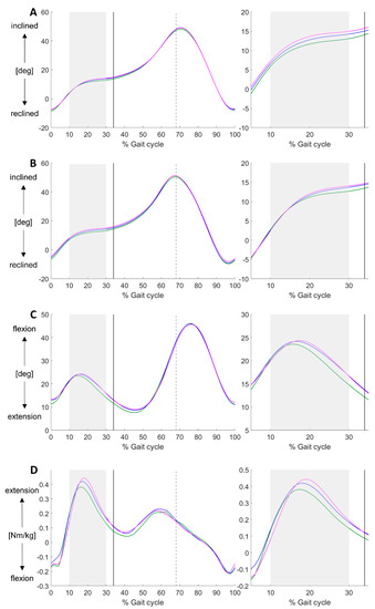 Mean SVAIMU [deg] (A), SVA3DGA [deg] (B), knee flexion-extension angle [deg] (C) and internal knee flexion-extension moment [Nm/kg] (D) during the gait cycle for refHH (green), lowHH (blue) and highHH (pink). The shaded area indicates the midstance phase (10–30%), the black line indicates the instant of midstance (34%) and the dashed line indicates toe off (68%).