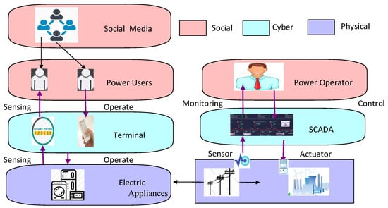 The smart grid extends the traditional electric system from a producer-controlled physical system to a cyber-physical system that supports consumers’ active engagement in energy management. Human factors in the smart grid also include power consumers, as well as power operators, and both of them usually interact with the physical system through the information system. Power users can communicate with each other on social media to share information and receive notifications from the power company. A typical model for a large-scale CPS combined with the social domain is shown in Figure 5, which forms a cyber-physical-social system.