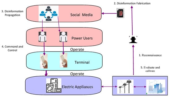 Disinformation in different fields has different uses [32]. Governments can use disinformation to exercise control over groups of people. Businesses can use disinformation to maintain or repair their own reputation or to damage the reputation of a competitor. In SCAC, as Figure 4 describes, the vulnerability of social media and the smart grid can be exploited, and when the disinformation is diffused as expected, the command and control are about to start. The attack will penetrate from the social domain, through the cyber domain, and reach the physical domain to change the electricity load. When the difference between the manipulated demand and the actual demand is large, the state of the physical system may have an exceptional transition.