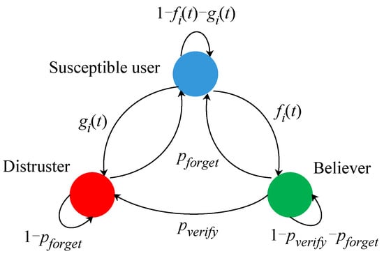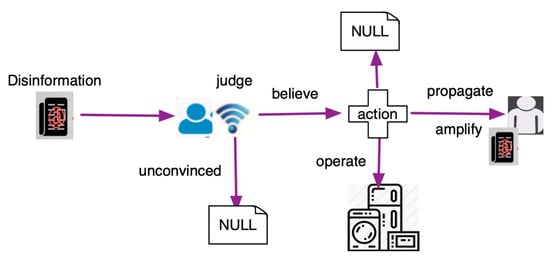 The user behavior model is very important in disinformation delivery [32]. Figure 7 depicts the user behaviors in SCAC after receiving the message. The user will judge the message’s authenticity and credibility. If he/she believes in the content, the user may forward the message to other power users who may or may not be members of the social media platform; some of the believers may take action. In the chain of propagation and attack, there are many uncertainties in each link, so a model of the stochastic process or probability is necessary to describe the user behaviors.