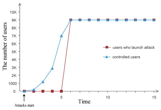 An example of a fast attack is shown in Figure 8. We describe the evolution of the number of users who believe in disinformation (i.e., controlled users) and the number of users who change their demands based on disinformation (i.e., users who launch attacks passively). Disinformation is propagated on social media at t = 0. The number of users who believe in the disinformation increases over time, and the number starts to increase drastically from t = 5 .