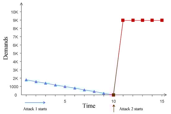 In this attack mode, some pieces of disinformation are generated first to gradually change the demands of users in one direction and then abruptly change the demands in the opposite direction, which can effectively utilize the demand-response idea to achieve the larger attack impact. We use an attack sequence T s = { t s 1 , t s 2 , , t s N } to describe the attacks from multiple pieces of disinformation. Attack action t s i means an attack of the ith piece of disinformation. T s can be divided into two parts: gradually change demands; and abruptly change demands in the opposite direction.
