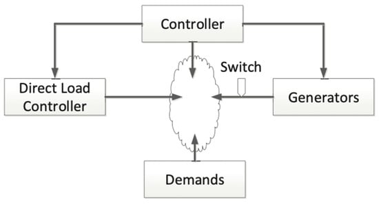 Figure 12 depicts a simplified system model of the power grid, which is comprised of the central controller, direct load controller, generators, and demands of users. The central controller regulates the generators and the direct load controller based on the frequency. When demands are not equal to generation, the frequency fluctuates continuously. A serious fluctuation can cause the switch connected to the generators to turn off. When the frequency is higher than 50 Hz, the central controller first instructs the direct load controller to try to increase the use of power. If the frequency is still higher than the normal frequency, the output from the generators is decreased. Conversely, when the frequency is lower than the normal frequency, the controller first regulates the direct load controller to try to decrease the use of power.
