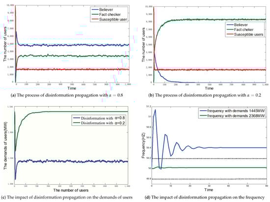 In Figure 13a,b, the process of disinformation propagation is shown. We can see that the number of believers converges. A larger α can obtain a larger number of believers. We show the demands of users under two kinds of situations in Figure 13c. A larger α can achieve greater fluctuations in total demand. When the propagation reaches the stable state and α is equal to 0.2, we can see that the demands have a very small change. When α is equal to 0.8, the total demands have a bigger change. In Figure 13d, we show the changes of frequency under two kinds of demand changes. From this result, we can clearly see that when the piece of disinformation with α = 0.8 is propagated among users, total demands change from 2400 MW to 1445 MW when users have executed operations based on the disinformation at 8 p.m. After that, the frequency starts deviating, and the duration for which the deviation of frequency exceeds the threshold 0.2 Hz is longer than 20 s. The result leads to the disconnection of generators. When α is equal to 0.2, the generators are not disconnected. The situation of α = 0.8 illustrates that the social collective attack by propagating disinformation on social media is effective when an attacker can generate the proper disinformation.