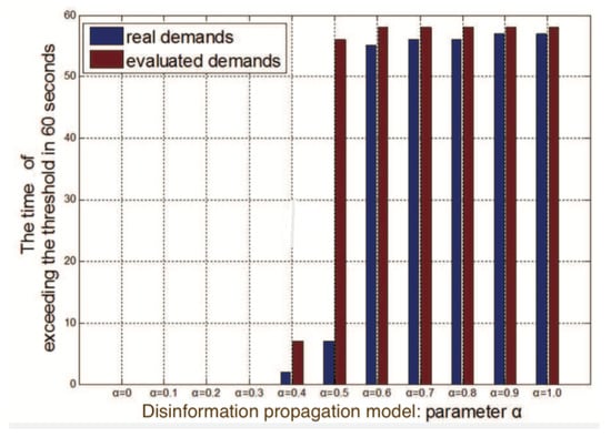 In Figure 14, we show the duration for which the deviation of the frequency exceeds the threshold in 60 s under real demand changes and estimated demand changes with respect to α . Comparing the attack effects of real demands and evaluated demands under the fixed α , we can see that except for α = 0.5, the evaluation of the disinformation attack can relatively accurately predict whether a piece of disinformation with a fixed parameter α can cause instability. When α is equal to 0.5, the disinformation attack can cause the new demands to be in the range [1600 MW, 1700 MW]. In Section 5.2.3, we show that when demands are changed from 2400 MW to d(d ∈ [1600 MW, 1700 MW]), the duration for which the deviation of the frequency exceeds 0.2 Hz has a drastic change. Therefore, a small evaluated error between real demands and evaluated demands would lead to a significant difference. In summary, for most of the situations, our evaluation method is accurate to reveal whether the instability of the power grid occurs due to the corresponding disinformation attack.