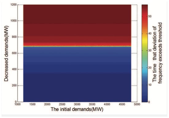 In Figure 15, we show the relationship among the initial demands, decreased demands, and the duration for which the deviation of the frequency exceeds the threshold. The initial demands refer to the demands before the demands of users are manipulated. Decreased demands mean the demands that are decreased by users because of social collective attacks. For the fixed initial demands, with the increase in the number of decreased demands, the color tends to be red, which means that a larger change in demands can have a greater impact. For the fixed number of demand changes, we can see that under different initial demands, the color is the same, which means that the initial demands are not directly related to the impact.
